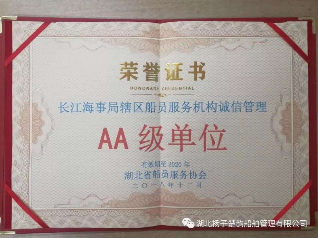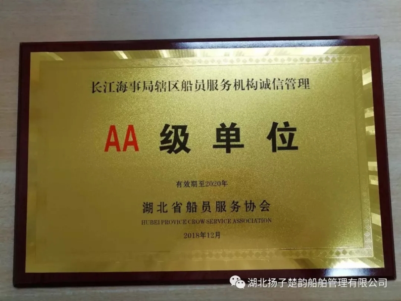 2018年12月11日在湖北省船员服务协会第二届二次会员大会暨长江海事局辖区船员服务机构工作座谈会上,我司被授予乙级海船和内河船员服务机构诚信管理AA级单位。