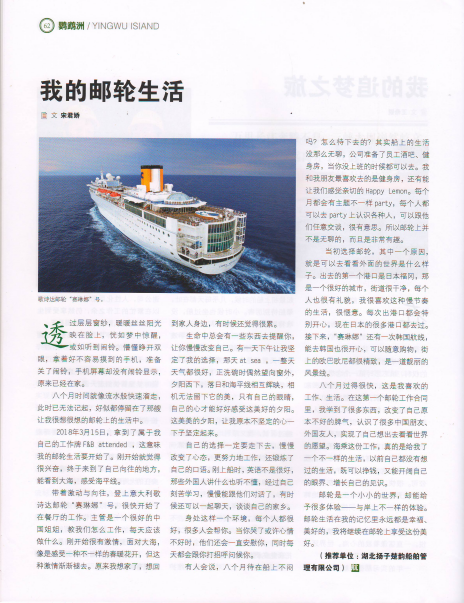 我司船员宋君娇撰写的“我的邮轮生活”被刊登在《新航运》第四期杂志上。