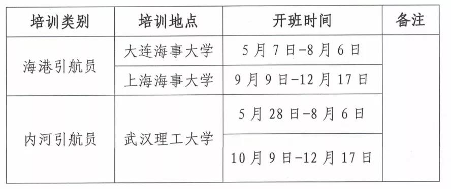 根据《中华人民共和国引航员管理办法》(以下简称《办法》)规定,申请引航员适任证书,应当完成引航员适任培训,培训安排见附件1。各培训点应按要求将培训课程设置、培训师资等安排在开班前报所在地直属海事局进行课程确认。各直属海事局要做好日常监督检查工作。