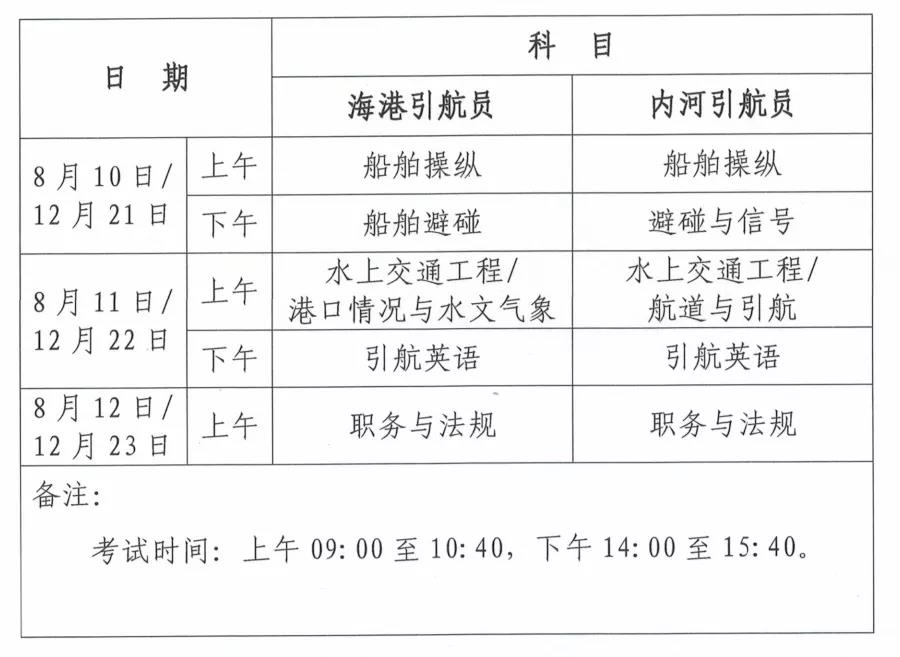 引航员理论考试时间和科目安排见附件2,引航员适任评估在理论考试结束后进行。