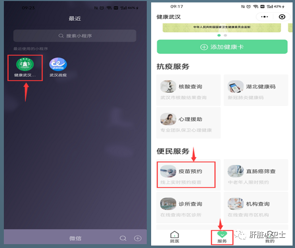 1、打开微信聊天界面,下拉搜索”健康武汉”,进入健康武汉微信小程序,选择“服务”,便民服务,疫苗预约界面。