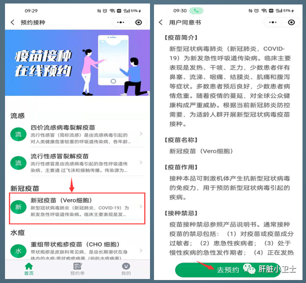 2、进入疫苗预约界面后,点击“新冠疫苗”,仔细阅读知情同意书后,点击“去预约”。