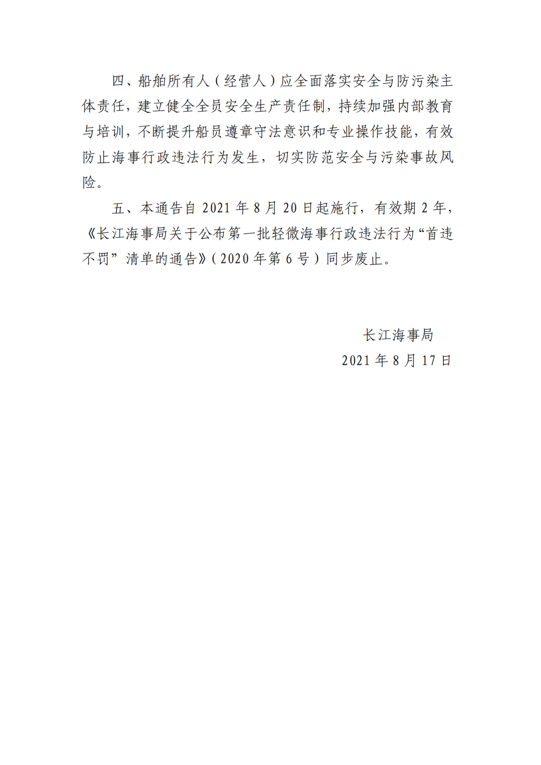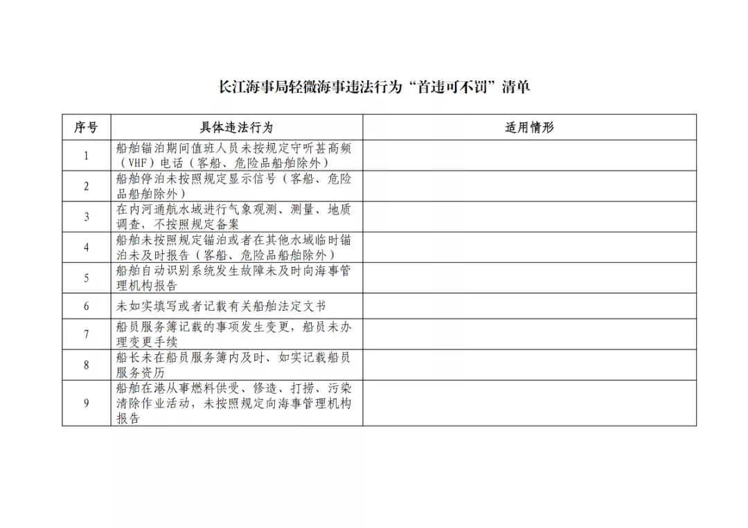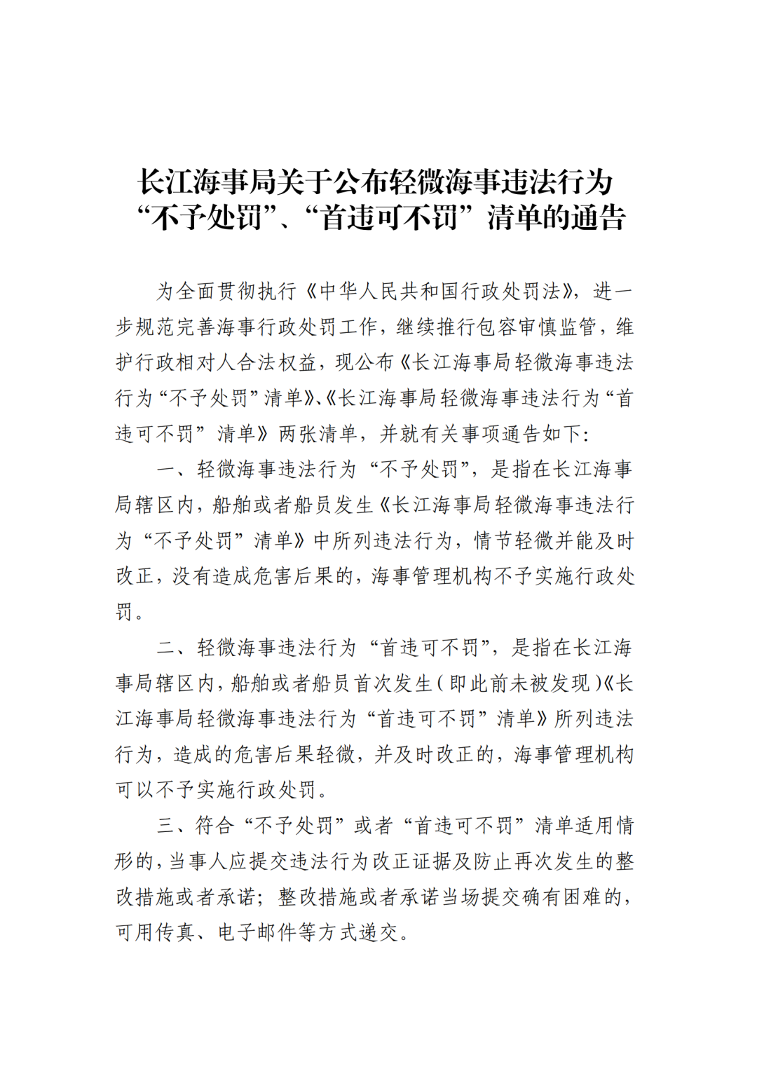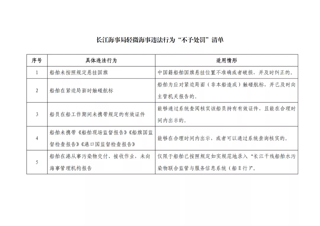 近日,长江海事局公布了轻微海事违法行为《“不予处罚”清单》和《“首违可不罚”清单》,明确对如下24类轻微海事违法行为实施“不予处罚”或“首违可不罚”。