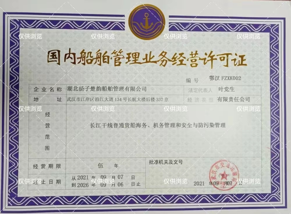 2021年9月7日,我司获得了武汉市交通运输局批准的《国内船舶管理业务许可证》,这将为公司参与长江经济带建设、从事长江干线普通货船船舶管理起到积极推动作用。