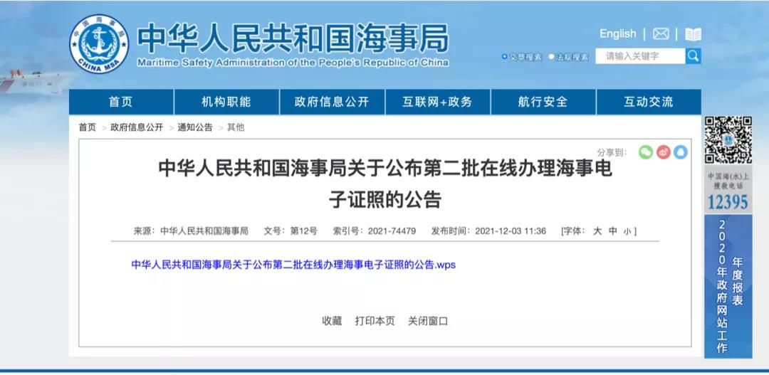 为深入推进“我为群众办实事”实践活动,方便人民群众办理海事业务,自2021年12月5日起第二批海事电子证照(见附件)可以在线办理。办理电子证照可通过海事“一网通办”平台(https://zwfw.msa.gov.cn)正常提交申请,对符合办理条件的,审批通过后平台将自动生成电子证照推送至申请人海事“一网通办”账户。