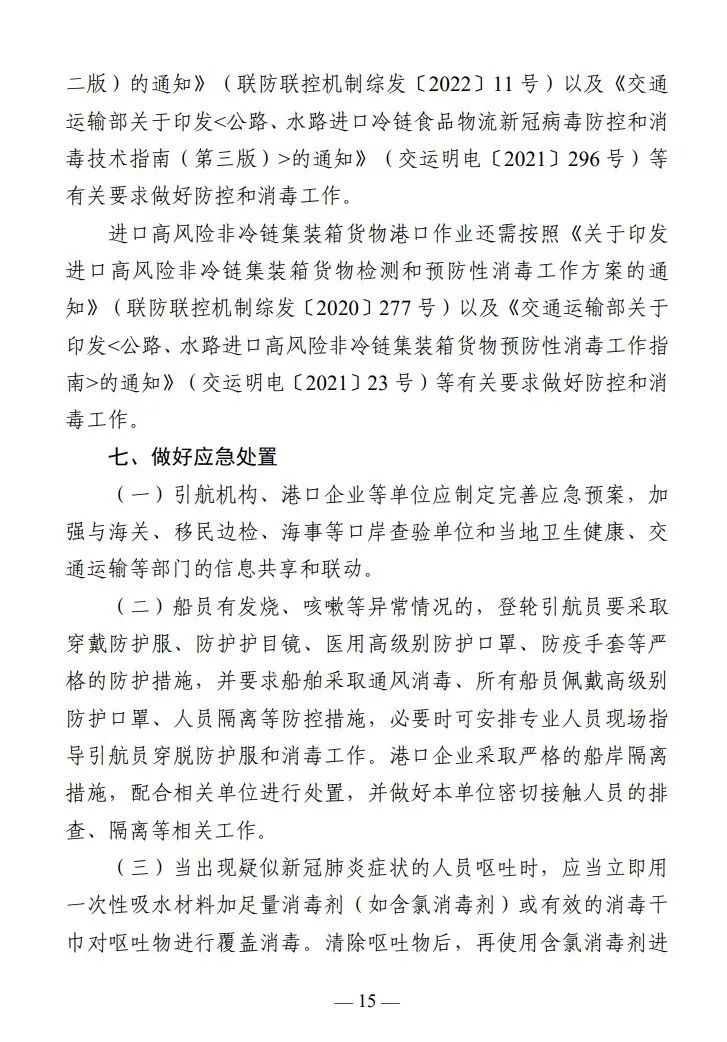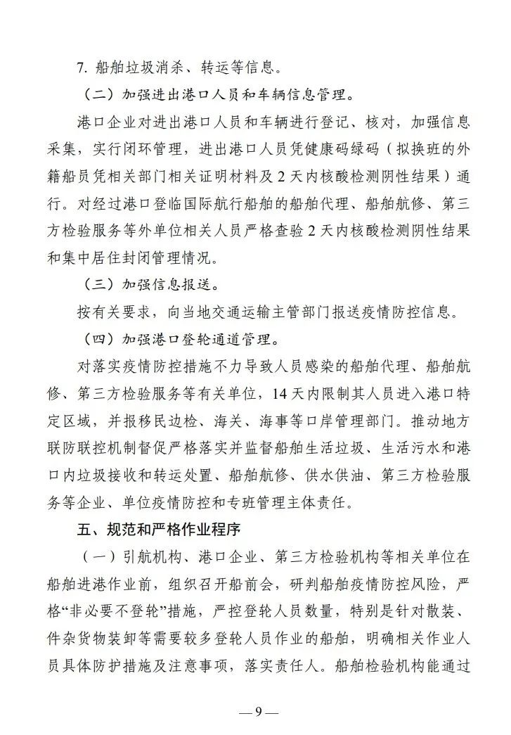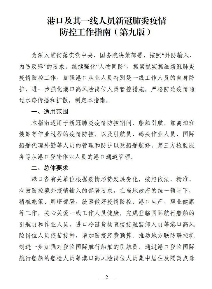 为深入贯彻习近平总书记关于新冠肺炎疫情防控重要指示批示精神,认真落实国务院联防联控机制最新要求,进一步强化水运口岸疫情防控,交通运输部组织修订了《港口及其一线人员新冠肺炎疫情防控工作指南(第九版)》(以下简称《指南》),现印发给你们。