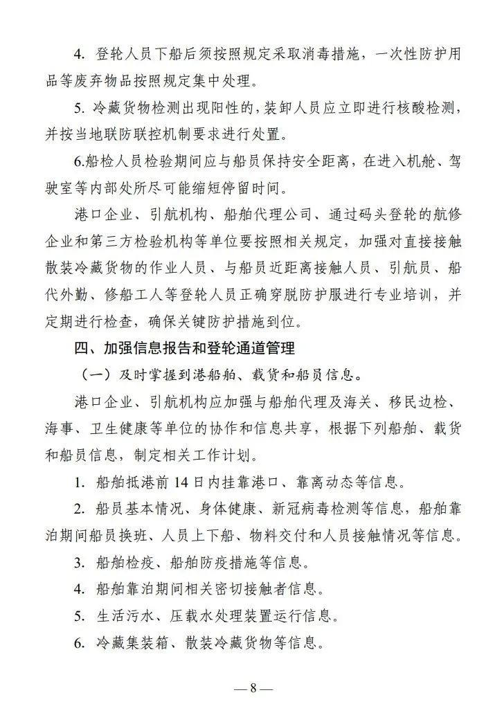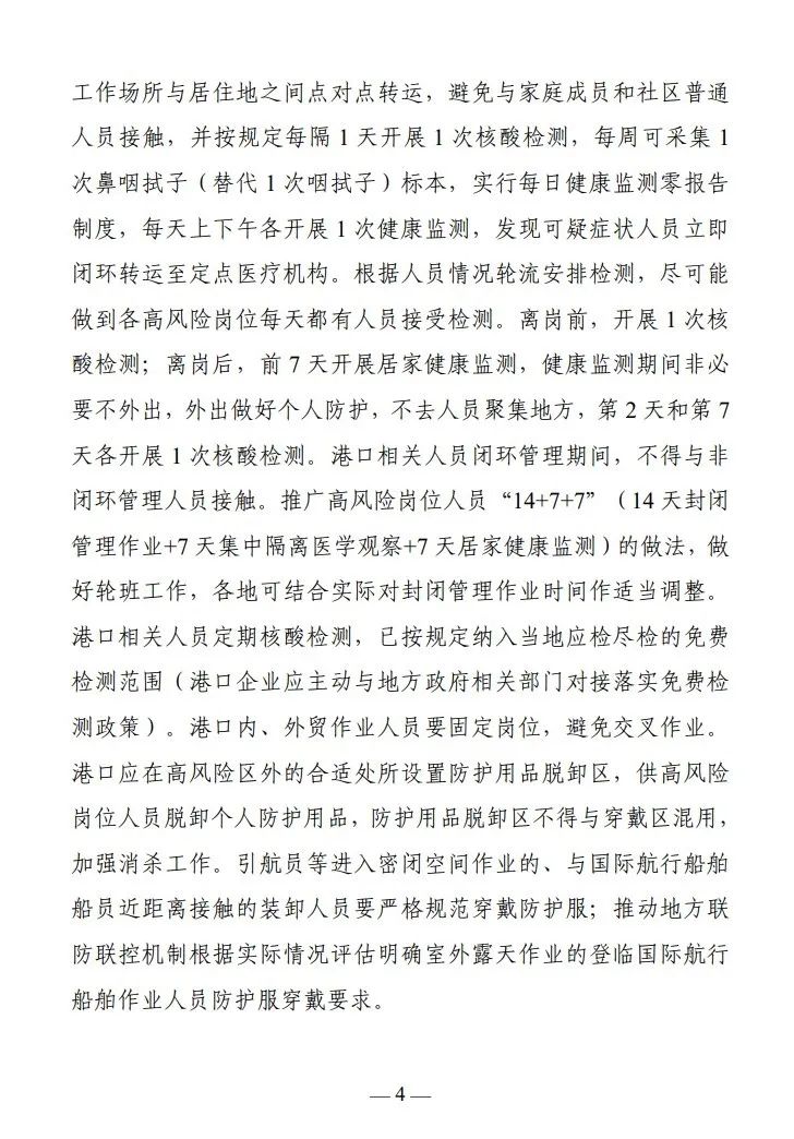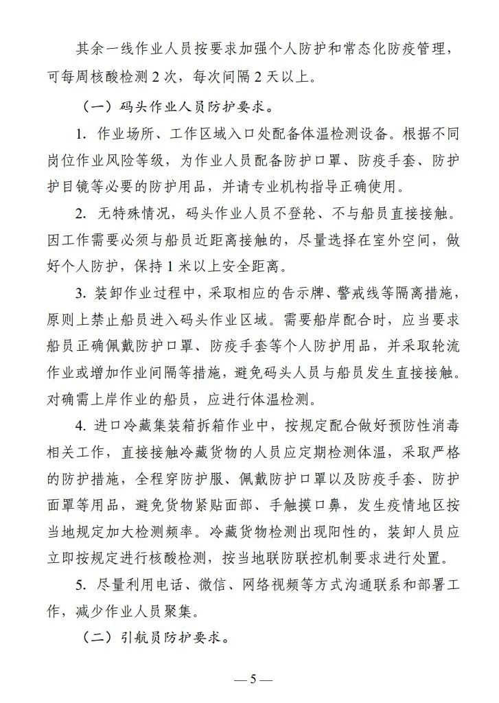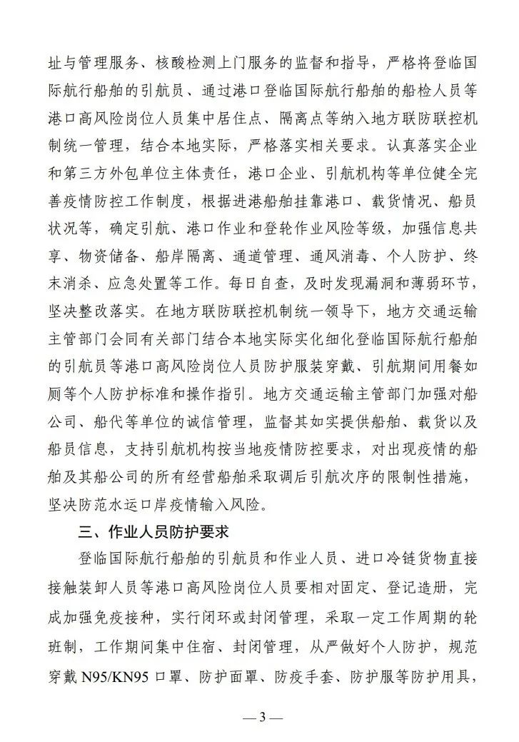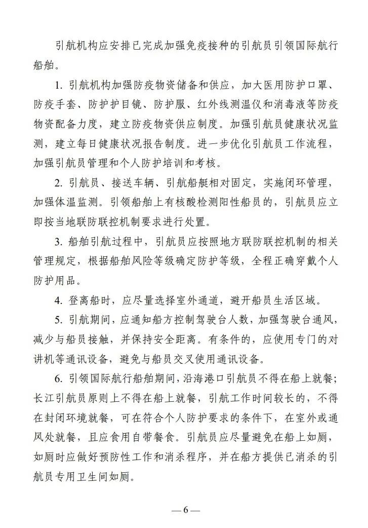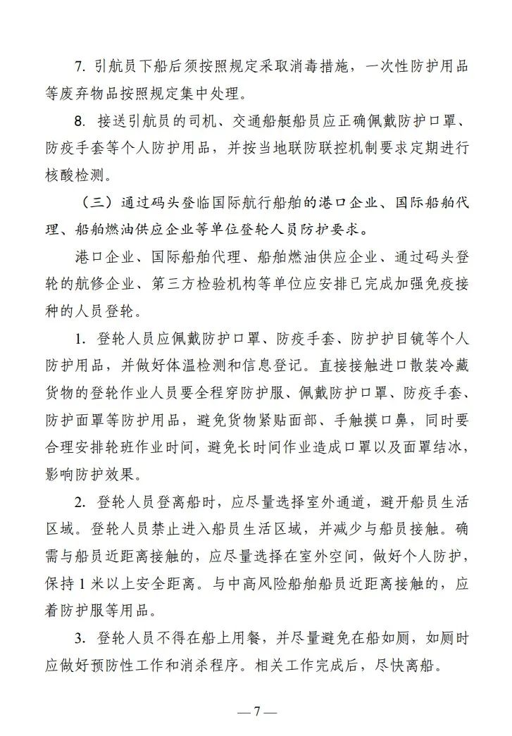 请各单位务必高度重视、高度警醒、高度负责,始终绷紧疫情防控这根弦,毫不放松抓好港口疫情防控,及时做好宣贯工作,将《指南》最新要求传达到引航机构、港口企业、船舶代理、船舶检验机构等有关单位,进一步加强现场巡查和监督检查,指导督促有关单位切实落实主体责任,确保一线人员特别是高风险岗位人员防护措施要求落实到位。各单位在执行过程中的意见建议请及时反馈。