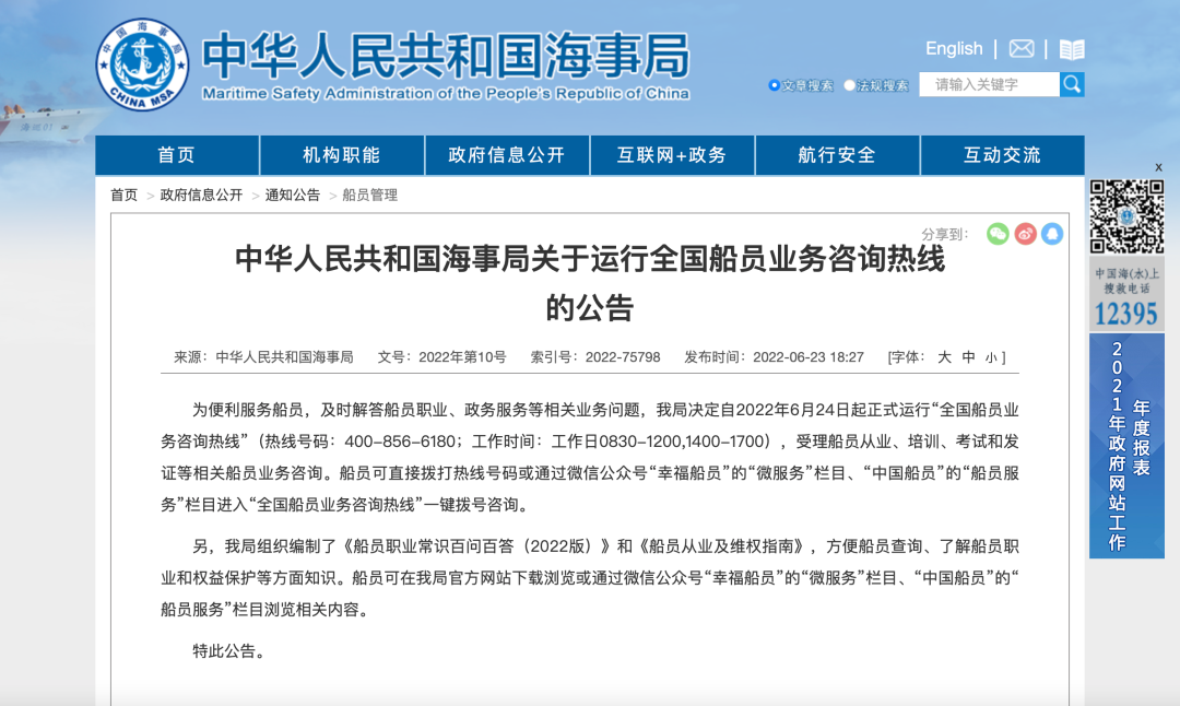 为便利服务船员,及时解答船员职业、政务服务等相关业务问题,我局决定自2022年6月24日起正式运行“全国船员业务咨询热线”(热线号码:400-856-6180;工作时间:工作日0830-1200,1400-1700),受理船员从业、培训、考试和发证等相关船员业务咨询。船员可直接拨打热线号码或通过微信公众号“幸福船员”的“微服务”栏目、“中国船员”的“船员服务”栏目进入“全国船员业务咨询热线”一键拨号咨询。