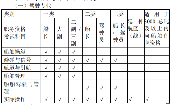例如:内河一类三副的适任培训,包括船舶操纵、避碰与信号、航道与引航和船舶管理四个科目及实操培训,培训