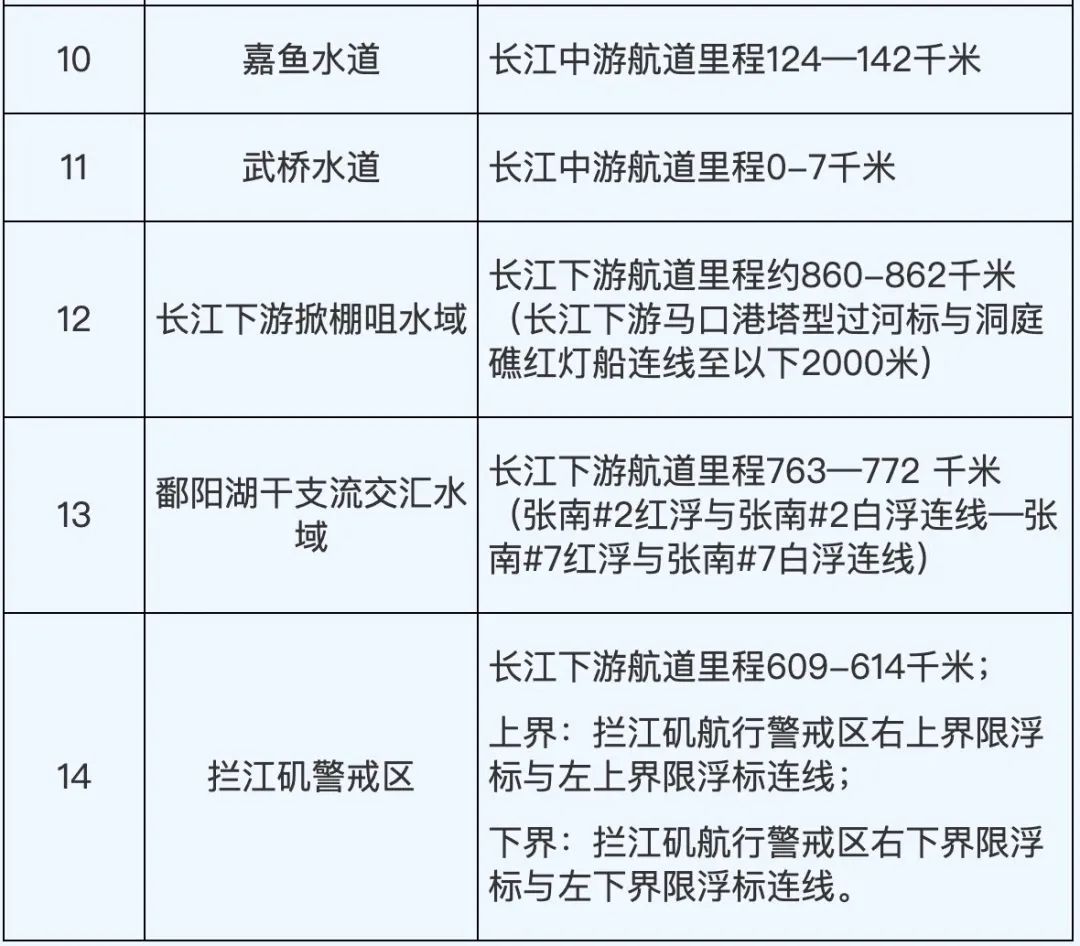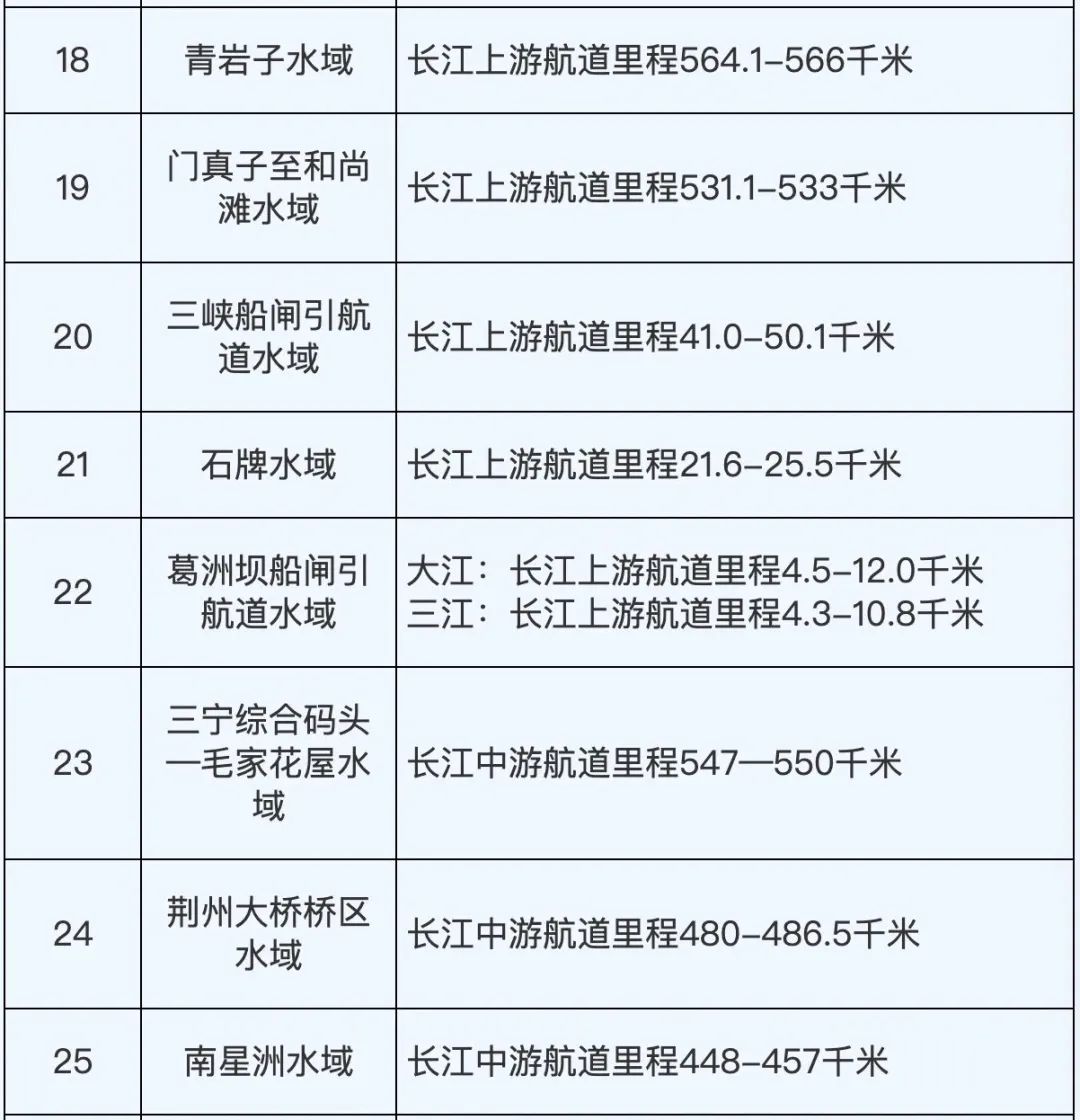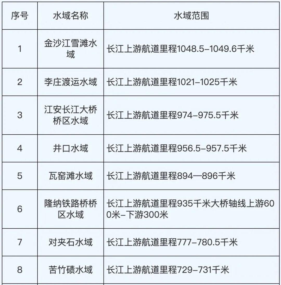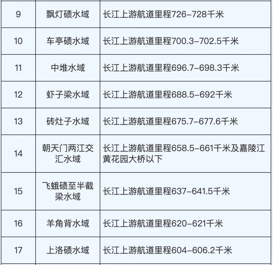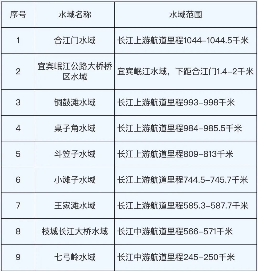 根据长江干线四川至安徽段2023年二季度通航环境、通航秩序与安全状况等因素,经长江海事局综合评定后,划定合江门等14处水域为一级水域、金沙江雪滩等36处为二级水域、其他水域为三级水域。请相关单位、船舶严格遵守有关规定,认真落实各项安全措施,保障船舶航行安全。
