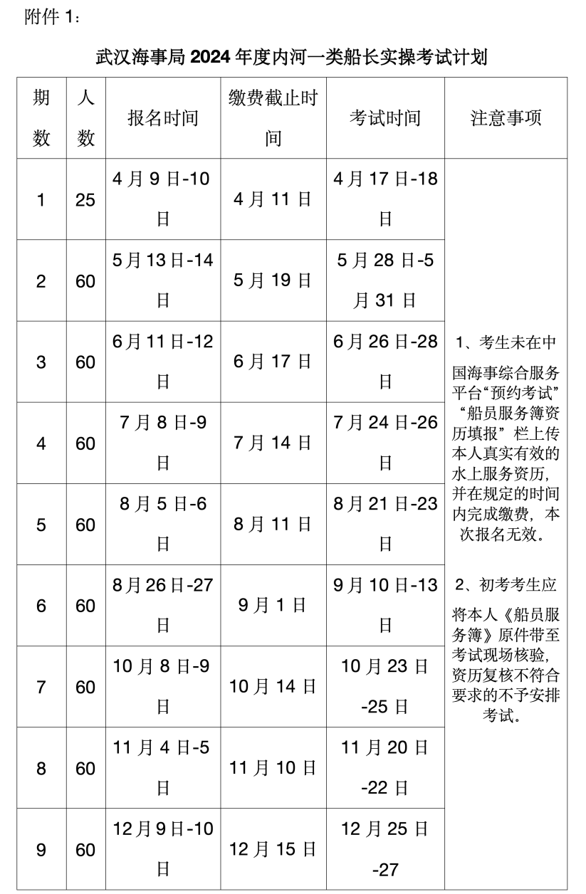 一、2024年度武汉海事局内河一类船长实操考试计划: