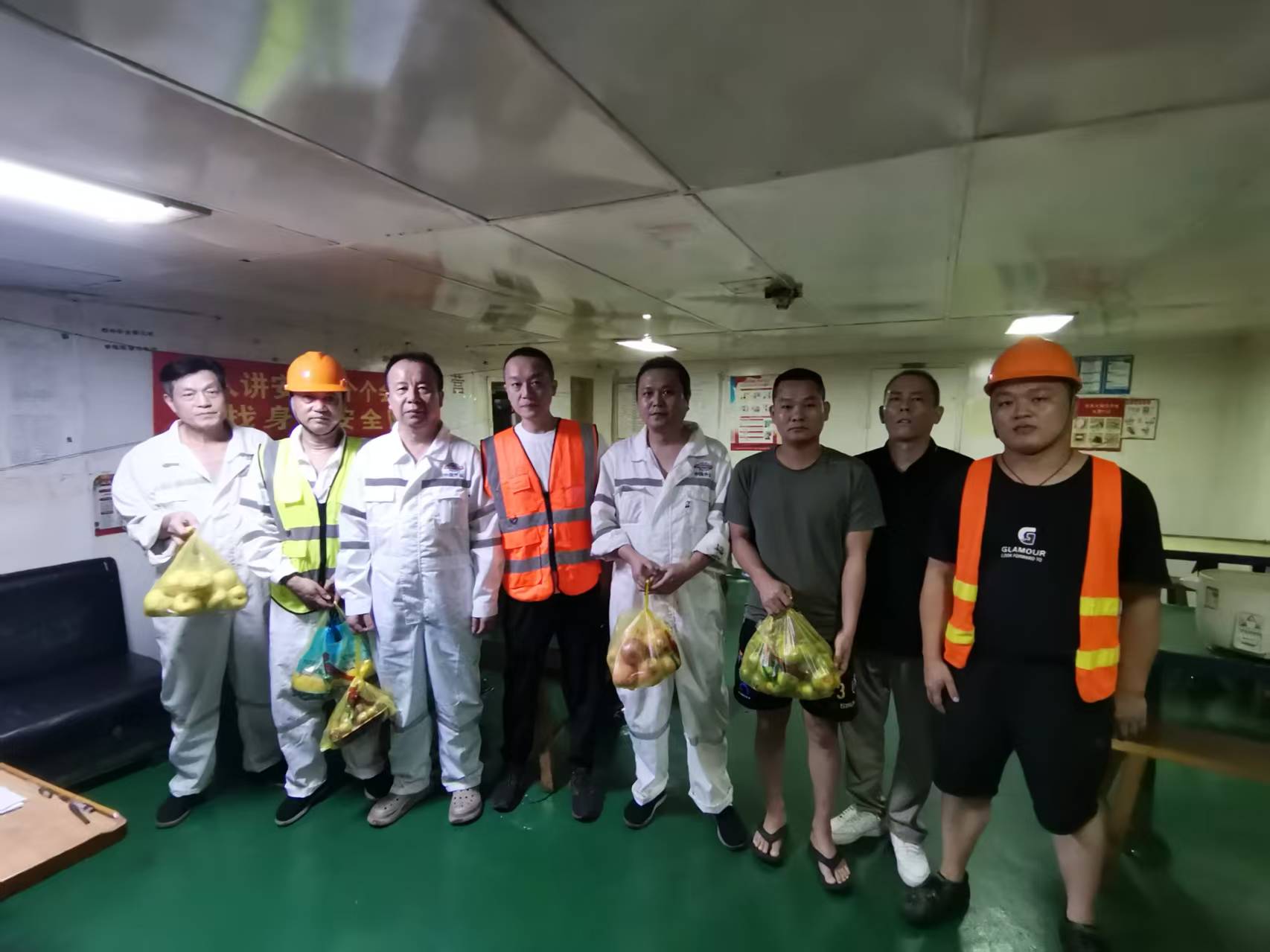 在船期间,莫经理送上了水果,提前祝船员朋友们国庆、中秋佳节幸福快乐。与船员们进行了交流,了解了大家在船工作生活情况,叮嘱船员朋友们时刻牢记安全、严格遵守安全规章、做好安全措施,确保船舶安全和人命安全,高质量完成生产任务。船员们对公司的慰问表示感谢。